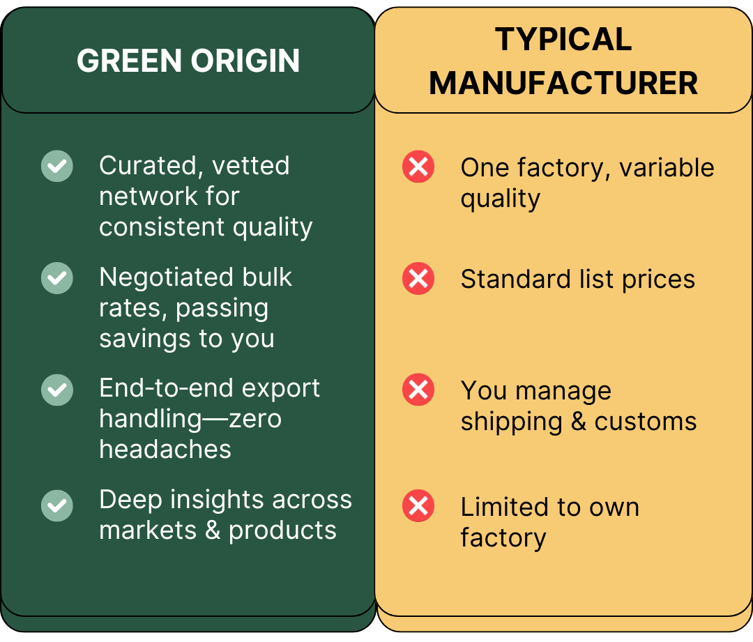 With smooth exports, reliable supply, and a clear sustainability focus, we make it easy for B2B brands to switch to greener alternatives.